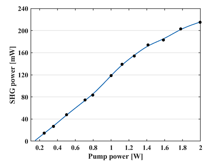 图1. 光纤耦合PPLN模组输出功率随泵浦功率关系图