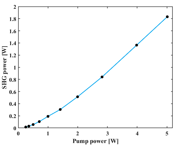 图2. 周期极化铌酸锂倍频模组的输出功率随泵浦功率的关系图(0.25-5W)