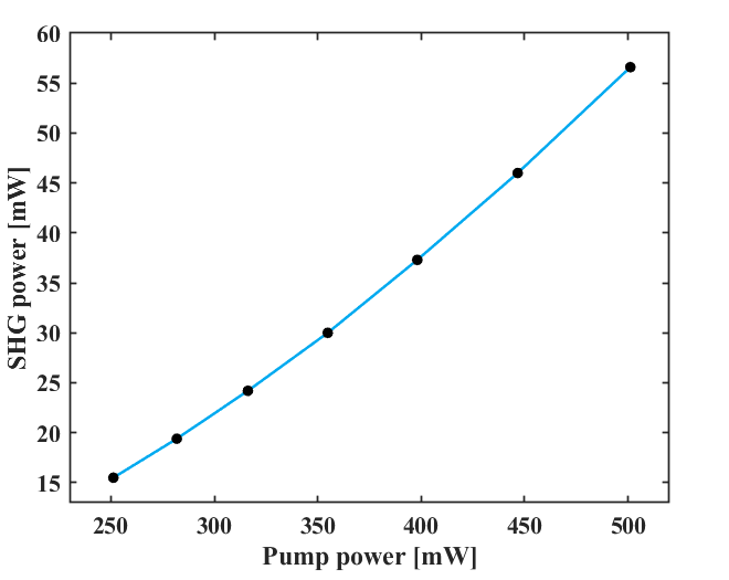 图3. 周期极化铌酸锂倍频模组的输出功率随泵浦功率的关系图(250-500mW)