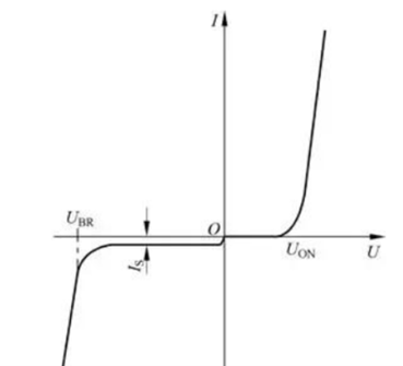 图片中的示意图通过电压-电流曲线直观展示了二极管在正向和反向偏压下的行为:导通电压UON表示二极管正向导通所需的阈值电压,超过后电流迅速增加;反向饱和电流Is是反向偏压下未击穿时由少数载流子形成的微小稳定电流;而反向击穿电压UBR则是雪崩击穿的临界点,当反向电压达到此值时,内建电场强度足以使载流子碰撞产生连锁倍增效应,导致反向电流指数级剧增,从而完成对雪崩击穿原理的量化描述。