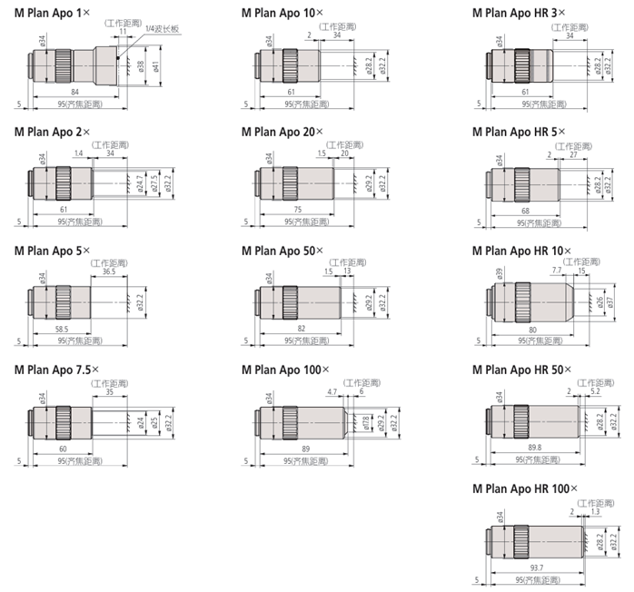 三丰明视场可见光物镜M Plan Apo/M Plan Apo HR参数表: