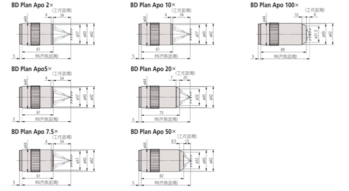 上述规格栏中的分辨力和物镜单体焦深是根据基准波长(λ=0.55µm)计算得出的值。平场复消色差物镜BD Plan Apo 2×观察反射率较低的检测对象时,建议搭配使用1/4波长板B(No.02ALN380)和偏振光单元。 注)工作距离会缩短4mm。
