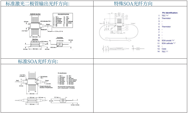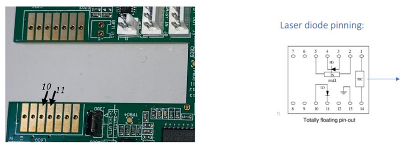 注意:如果使用SOA驱动,请确保SOA按正确方向安装。参考SOA的引脚(下方,右侧)并与标准Type1激光二极管(下方,左侧)进行比较,验证SOA正极和负极是否连接到SOA驱动正确的焊盘: