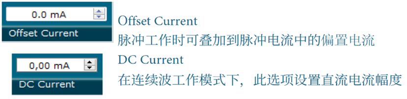- 偏移参数(仅脉冲模式)或直流参数(仅连续波模式)用于配置直流电流(脉冲模式中的偏移);