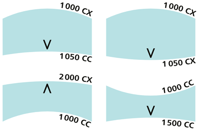 图2:标记箭头指向曲率半径更大的表面(即曲度更弱的一侧)