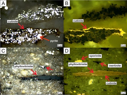 A.富含黄铁矿的叶状镜质组(油浸法,反射白光,样品20);B.带有角质边叶状镜质组(与A中的图像相同,但拍摄于紫外线光下);C.叶状镜质组呈透镜状,边缘不规则(油浸法,反射白光照射);D.叶状镜质组中平行排列的角质颗粒(与C中的图像相同,但拍于紫外线光下)。