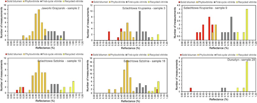 图2:来自PKB格拉日卡雷克/萨里斯构造单元Szlachtowa组的固体沥青和各种形式的玻璃质岩反射率直方图