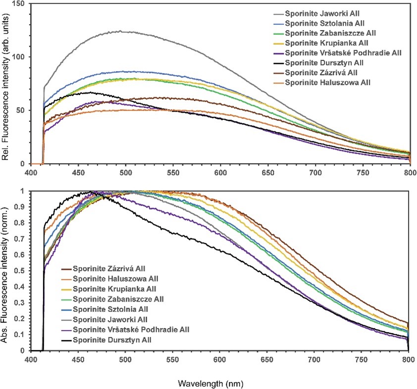 图3:PKB的Grajcarek/Saris构造单元中Szlachtowa组孢子石的发射光谱。顶部一一相对荧光强度;底部一一绝对荧光强度。