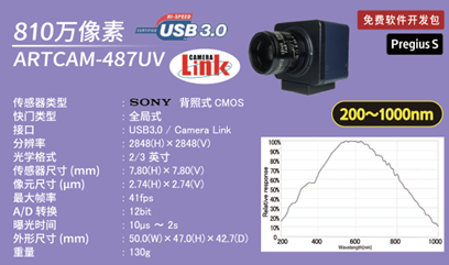 分辨率与像素尺寸:ARTRAY ARTCAM-487UV提供约810万有效像素,像元尺寸4.65μm,平衡了分辨率和单个像素的感光能力。