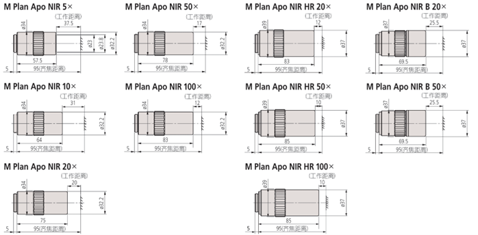 Plan Apo NIR标准型、M Plan Apo NIR HR高分辨力型及M Plan Apo NIR B超长工作距离型,均采用无限远校正与平场复消色差技术,支持明视场、近红外、偏振光及微分干涉等多种观察方式,同时兼容自动化检测系统。