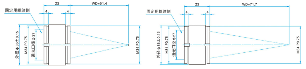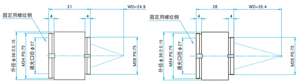 真空用聚光透镜/真空用聚焦镜HFDLSQ-V/HFTLSQ-V系列共6个型号:HFTLSQ-30-40PF1-V,HFTLSQ-30-50PF1-V,HFTLSQ-30-60PF1-V,HFTLSQ-30-80PF1-V,HFTLSQ-30-100PF1-V,HFDLSQ-30-150PF1-V。焦距覆盖40mm至150mm。所有镜头的外径和通光口径统一为36mm与27mm,入射容许角均为±1°。随着焦距增加,数值孔径(NA)从0.34递减至0.09,工作距离(WD)从24.9mm递增至131mm。螺纹规格方面,40mm与50mm型号安装用螺纹为M28 P0.75,其余型号均为M34 P0.75;所有型号固定用螺纹均为M34 P0.75。