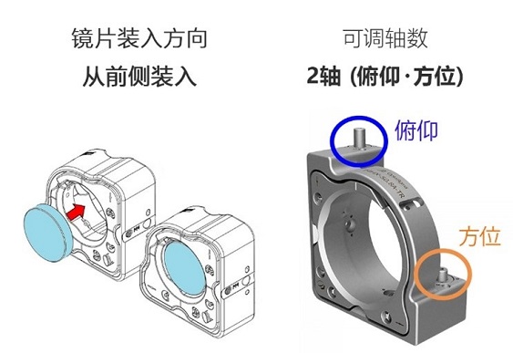 需要注意的是,顶端调节高稳反射镜支架固定镜片的片簧的压力调整用螺钉的扭矩建议值为35 N·cm。用手无法拧动调整螺丝,请使用六角扳手对各轴进行调整,另备有MHX-12.7用旋钮式六角扳手(KCL1513)。除了六角扳手,也可选用MHX25.4/30/50.8/101.6专用旋钮(MHX-K-M6)调节上方调节高稳镜架。上方调节高稳镜架的镜片是从镜架前侧装入的,不需拆下镜架也能方便地加装镜片。可实现俯仰和方位2个方向的调节。