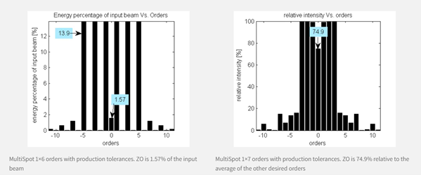对于奇数点衍射光学分束器,零级能量则以占其他所需级次平均能量(假设透过率为100%)的百分比形式标示。通俗易懂的说,就是对于奇束点分束,零级是最中间的一束,占其他分束平均能量的0-200%,具体看型号;对于偶数点衍射分束器(MS),零级能量以占入射光束总能量的百分比形式标示,通俗易懂就是对于偶数点分束,零级是最中间多出来一束,这一束一般占入射光能量的0.5%-5%左右,具体也是看型号。偶数和奇束零级举例图如下。