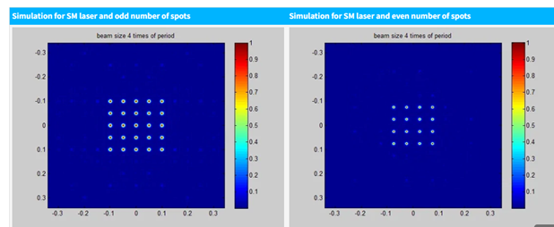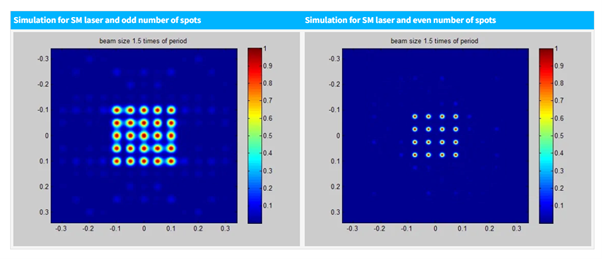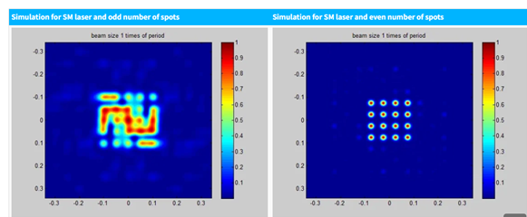 最小输入光束直径的大小由分束DOE规格书的设计参数决定,对于单模激光器,奇数个点分束的情况下,其最小入射光束直径的大小至少为DOE中周期数的3倍,如果偶数个点的衍射激光分束器,则入射光束至少为该尺寸的1.5倍。反过来,周期由以下公式给出:
