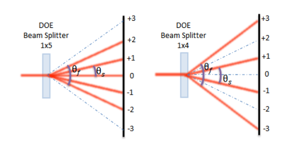 衍射分束器的分离角是相邻两束光的夹角,全角是最远两束光的夹角。分离角和全角是根据客户的要求进行设计的。从下图可以看出,对于具有奇数个输出光束的衍射光学分束器,分离角是0阶光束和+1阶光束之间的角度,0阶光束是所需的输出光束,处于被激活状态。对于偶数个输出束的分束器,分离角是+1阶光束和-1阶光束之间的角度,此时0阶光束不是所需的光束,处于未被激活状态。