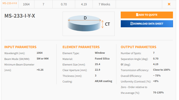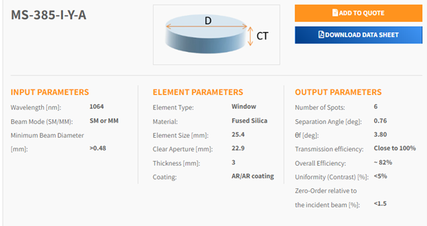 以MS-385-I-Y-A激光分束器为例子解析分束器参数,其中入射光波长是1064nm,对入射光直径要求不高,入射光直径建议大于0.48mm小于15.26mm,镜片直径是1英寸,通光孔径是22.9mm。分束数量是6,分离角是0.76度,也就是相邻两束光的夹角是0.76度,全角是3.8度,也就是最远两束光的夹角是3.8度。激光分束镜传输效率接近100%,也就是透过率是100%。衍射效率是82%,也就是6束光占入射光能量的82%左右,为啥不能占100%是因为有高阶次衍射,剩余的能量进入更高的阶次,形成高阶次衍射,高阶次衍射中最强点的占比需要模拟才能知道。激光分束镜均匀性小于5%,说明分束后6束能量差异很小。零级是6束的最中间多出来一束,这一束占入射光能量的1.5%左右。