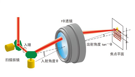 在普通的透镜中激光光束以角度θ入射到透镜时,在焦点平面上的f·tanθ的位置形成光斑。θ比较小时光斑到光轴的距离×与θ几乎成正比,θ变大时,将不成比例。fθ透镜利用透镜的畸变效果,相对于入射角θ使其出射角度为tan-1θ,即使θ变大,也能保持入射角度和焦点平面上的光斑到光轴距离成简单比例关系。因此,利用扫描振镜等的等速旋转运动而扫描的激光光束,不需要电气校正,在焦点平面上可形成等速直线运动的光斑。